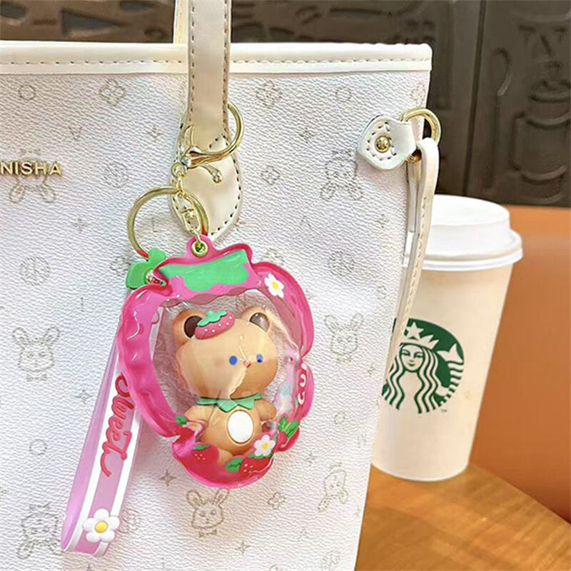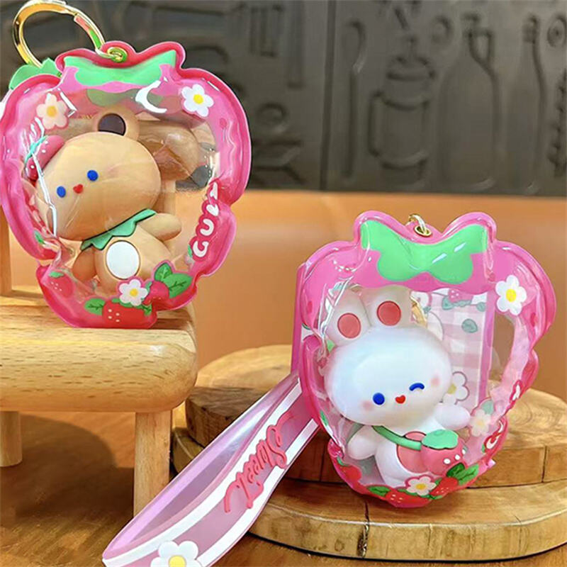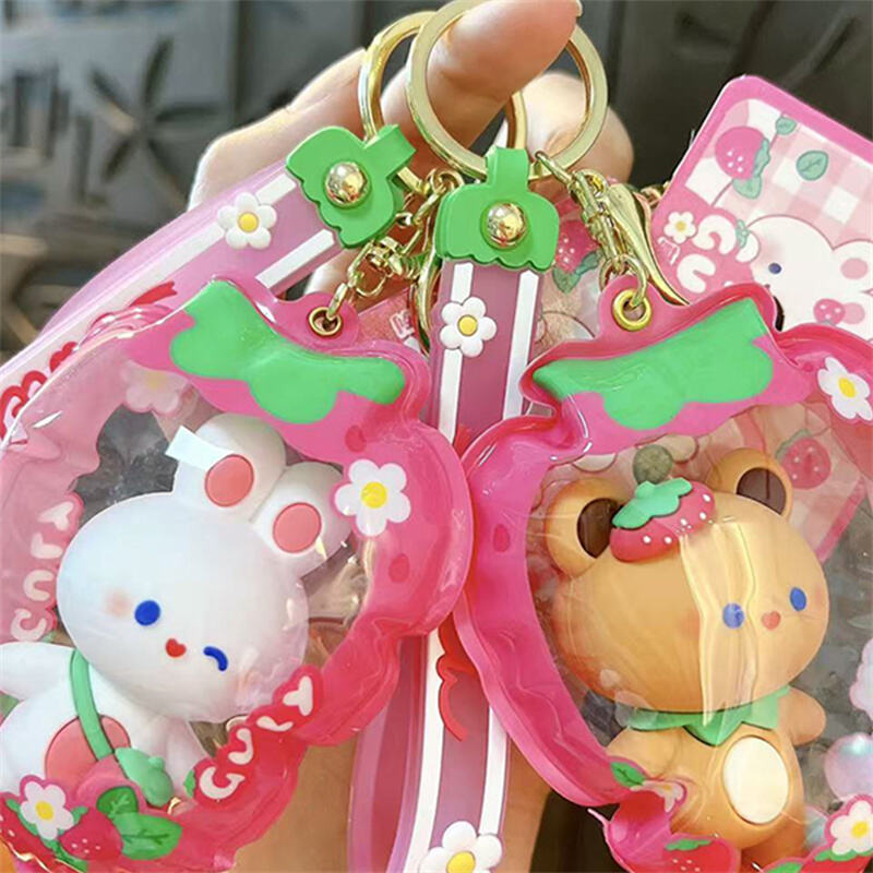 Adorable strawberry-shaped inflatable pouch keychain with a cute bear doll or rabbit inside!