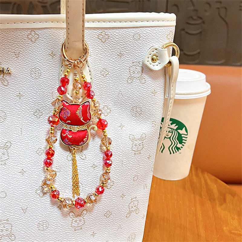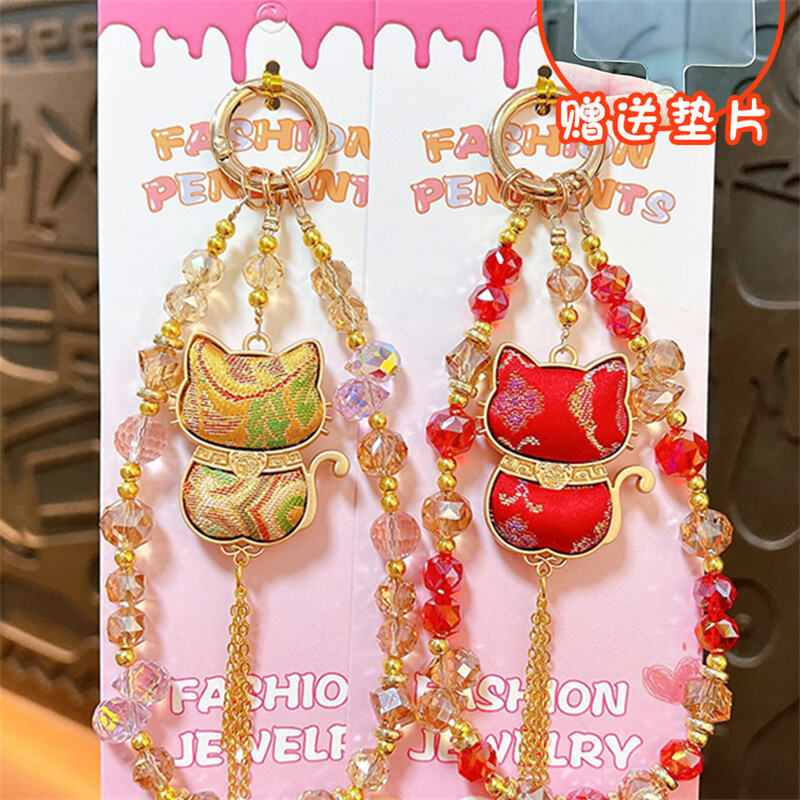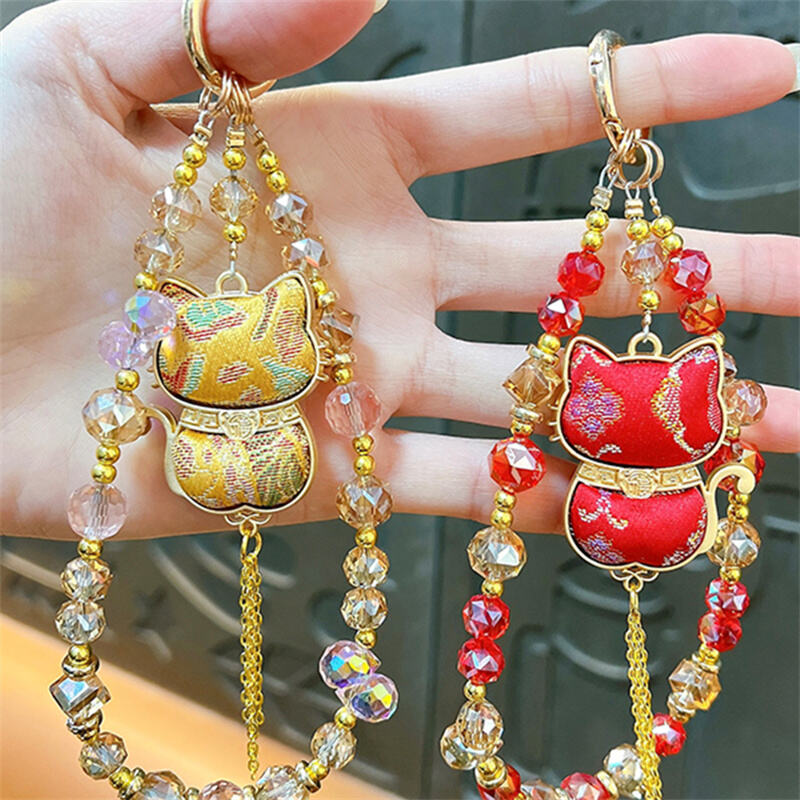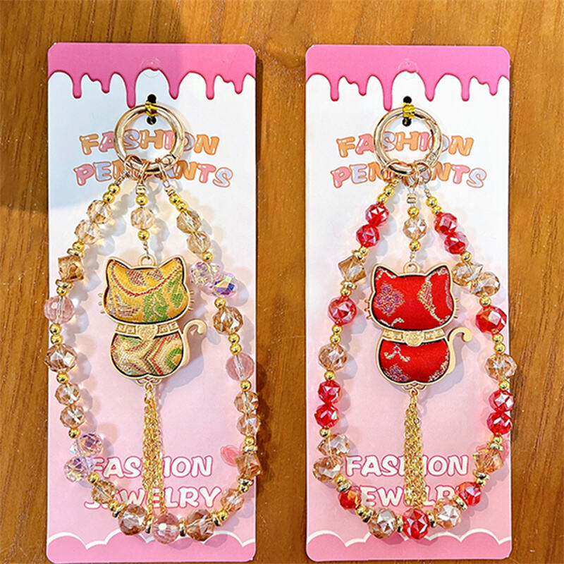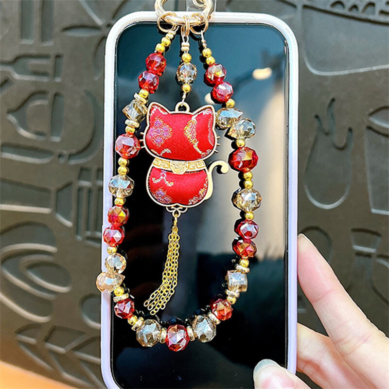 · Double-sided Lucky Cat pendant beaded lanyard, with sparkling crystal beads and metal accents