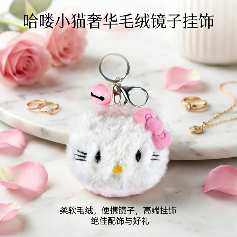 Materiał: Miękka, puszysta pluszowa obudowa w klasycznym stylu Hello Kitty, połączona z dwustronnym składanym zwierciadłem (ramka metalowa), metalowym breloczkiem do kluczy, haczykiem typu lobster clasp oraz małą dekoracyjną dzwonką.