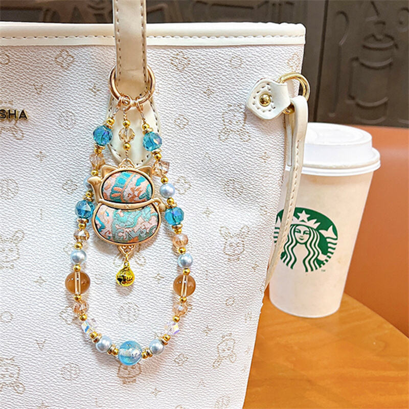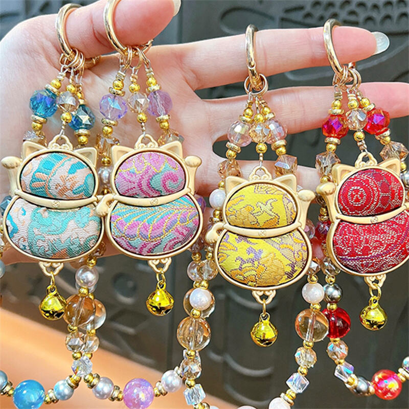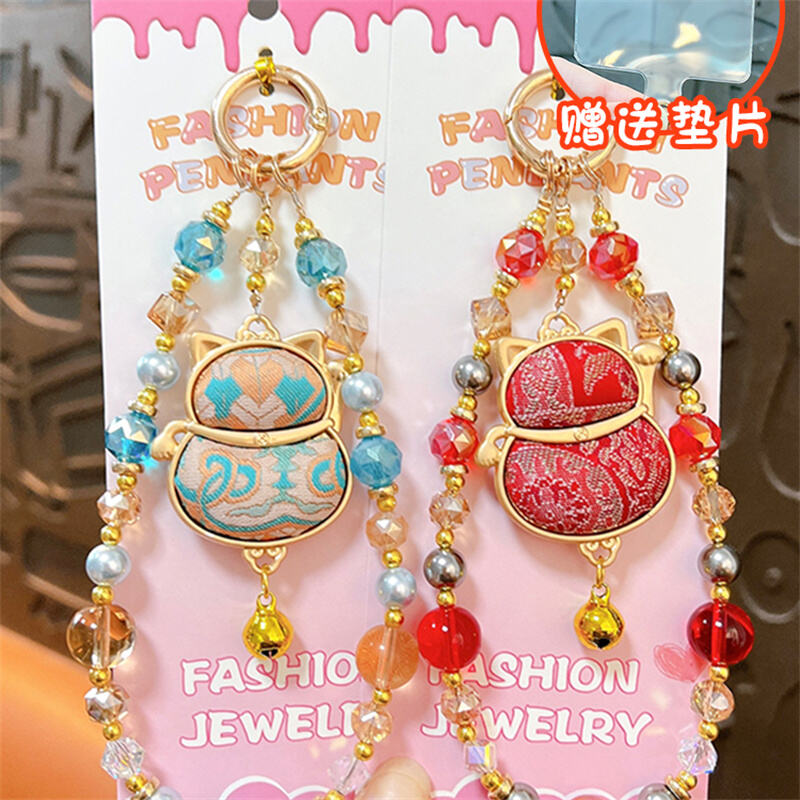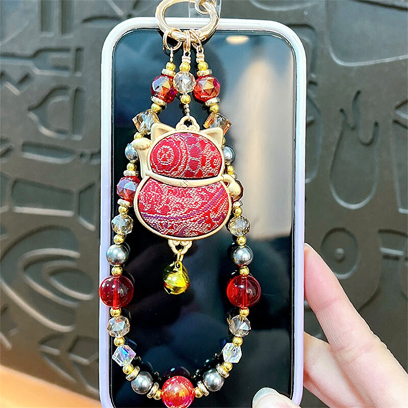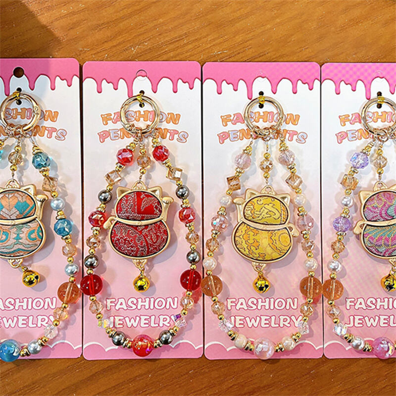 · Double-sided Lucky Cat pendant beaded lanyard featuring Song Brocade, a traditional Chinese fabric with luxurious texture